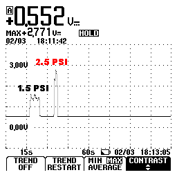 These are the voltage readings with two different pressures applied at the ref port on the DPFE sensor. Since this port looks at the exhaust pressure ahead of the catalytic convertor, it would be a quick way to verify a plugged cat, about 1 volt per PSI.