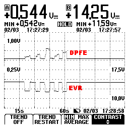 96 Ford Ranger 3.0 V6 74k miles.Top trace is DPFE signal to PCM, voltage increases with higher pressure. Bottom trace is EVR signal from PCM. EVR, will change with DPFE, to control EGR flow. Engine loaded about 1200 RPM.