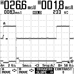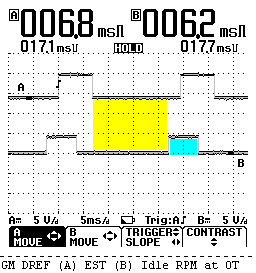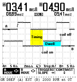 Scope is triggered on the DREF Signal (A), timing is shown as the time between the falling edge of DREF and the rising edge of EST, this is the amount of timing commanded by the PCM. Coil turns on at the rising edge of EST sooner or later as timing advances or retards. Dwell time increases or decreases along with it. This image shows EST at 2000 RPM.