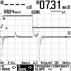 This image shows EST and coil negative signal along the same time base, and is triggered off the EST signal. Coil on is the rising edge of the EST signal, coil off is the falling edge of the EST signal. Here you can see the on-off times of the EST signal in relation to the coil charging and firing in the primary signal. In the primary signal, coil on is the falling edge of the primary signal that lines up with the rising edge of the EST signal. Current limiting is the next event in the trace, then the coil turns off, (inductive kick) this lining up with the falling edge of EST signal.