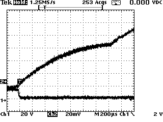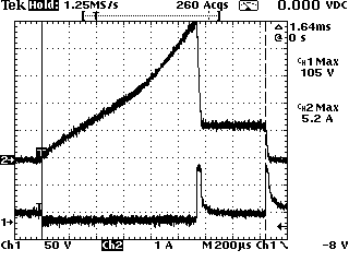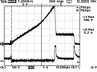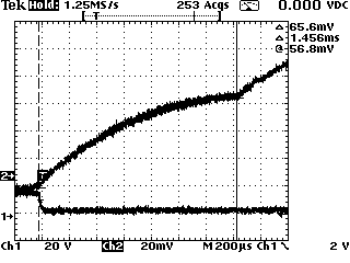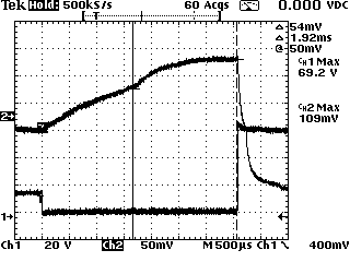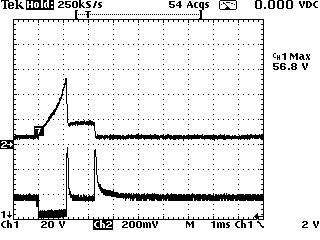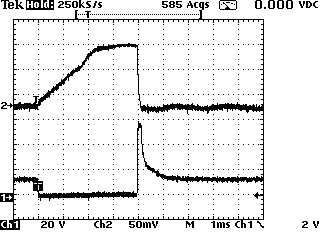 Injector current from low amp current probe looking at a late ford big block injector. Triggered off the voltage signal, (Ch1) the current trace shows amperage building to a point where the pintle actually lifts off its seat, about two third's of the total opening amps just to get it off its seat. This can be seen in the waveform better by opening up the timebase.