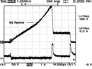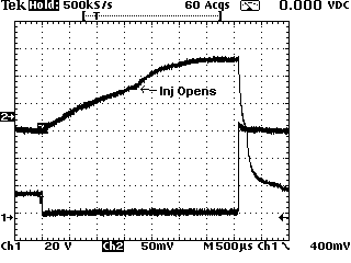 94 Chev PU 5.7 TBI Injector, Peak and Hold, PCM hits the Injector hard with current enough to get it open (about 4 amps) then internally switches in a resistive circuit lowering output just enough to hold it open. Easily seen in the current waveform.