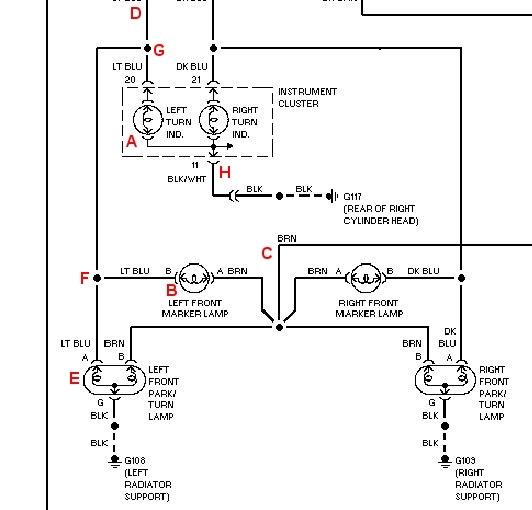 Left turn indicator bulb (A) is on when headlights are on, continually. Left front marker lamp (B) is out, pull marker lens bulb and find it is glowing faintly, voltage drop test connector, battery volts on either side of socket. Bad ground right? Where is the ground for this bulb? Need to look at wiring diagram. After seeing diagram, find one side of bulb (B) connected to positive wire (D) through (G) to front turn signal bulb, (E) ,at (F). What!? oh, the side marker bulb (B) gets its ground through the turn signal power side of the bulb (E) through (F). Power comes in from (C). What about when (D) through (G) to (E) is active? Oh, I forgot the side markers flash with the turn signal bulb on these when its active, so the marker bulb (B) only gets a ground through (F) when that wire (D) through (G) to (E) is inactive, making it flash on when the turn signal bulb (E) is off. That still doesn't explain why the turn indicator (A) is on when the headlights are on, oh, if the sidemarker bulb (B) wasn't getting a ground through the turn signal bulb, (E) Through (F), power would go back up the positive wire at (F) through (D) to (G) to indicator bulb (A), and turn it on, so..... that means the turn signal bulb (E) may have a bad element killing the ground through (F) to the side marker bulb (B). It did...