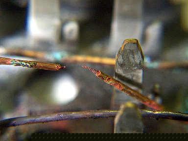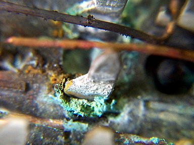 Another view tells the tale, this wire is being eaten by something, wait a minute, I know, this thing is mounted directly over the battery, now I know why the bluish green stuff looked familiar, battery acid! This thing is getting eaten by battery gases that probably fill the inside of this thing while the battery is charging.