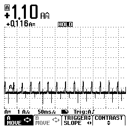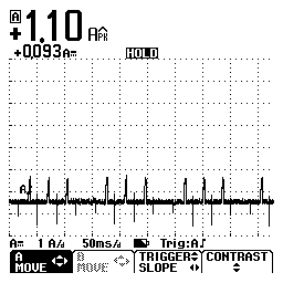 96 VW Jetta 2.0 Injected 4cyl, solid misfire, MiL light on, misfire code set, open Injector number four cylinder. How easy to find this by looking at main power to injectors using amp probe. Missing spike in the waveform indicates lost injector firing.