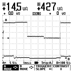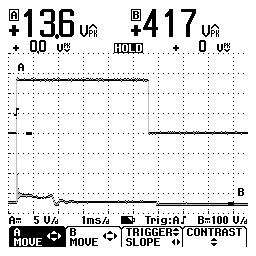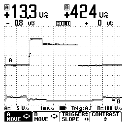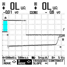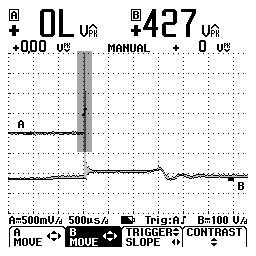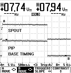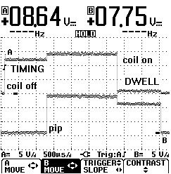 A is the SPOUT signal, B is the primary signal, the time lag appears to be about 300us. Current limiter is next event in the primary. To move in close on these areas, the time base and volts per division need to be adjusted to zoom in on them.