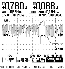 93 Acura Legend V6 main, sub o2 plot, (A) main, (B) sub (post cat) with propane added event, 2500 rpm engine at OT.