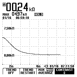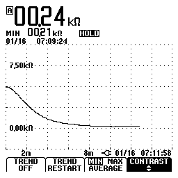 Resistance starts at almost 5k ohms, and slowly drops off as coolant warms to operating temp about 200 ohms. Thermostat opening is hardly seen here since the coolant in the radiator gets warmed from the heater core return line going directly to the radiator tank.