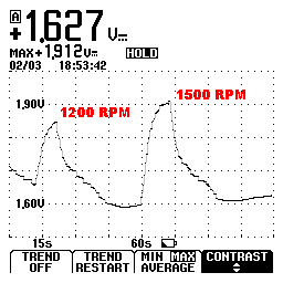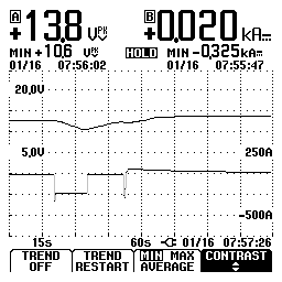 After restarting, the amps went to +56 showing the alternator doing its thing then slowly dropping off as the battery came back to life. Voltage level follows this by going up as amperage drops off. After getting the scope setup to do this the first time, its a lot easier doing the crank test with it versus hooking up the VAT or the big scope. And, you are load testing the battery as well. I love it!!!