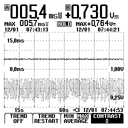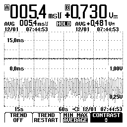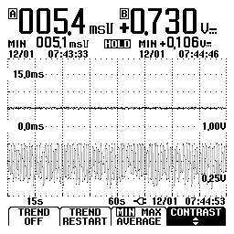 15 second cranking test, battery volts on (A) amps (Fluke 90i-610s probe) on (B). First downward spike on trace (B) is the starter being engaged, -325 amps just to start it turning. After the starter began turning, the amps leveled off to about -220 and stayed there for the full 15 seconds. The time from the end of the cranking test to the next spike is the time I spent hooking the coil back up.