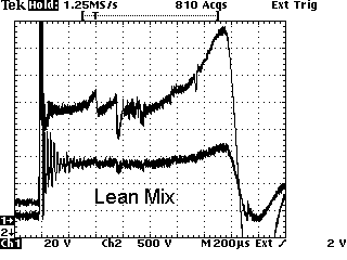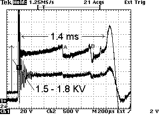 Here is a typical spark line I have zoomed in on to show how a scope will go in close and really look at what's going on with the actual voltage jump across the plug gaps. When you get in this close you can't see the initial spike or the coil oscillations, etc., only the spark line itself. The top trace is secondary, bottom trace is primary. Typical spark burn time should be at least 1ms, average is 1.2- 1.5, beyond this is too long. Spark KV should be 1.5- 2.0KV. Anything outside these parameters indicate problems that are easily seen in the spark line itself. The two events in the line, (A), (B), is the spark blowing out and restarting as a result of chamber turbulence and is normal. The spark is out for 20us (twenty millionth of a second). This is from a healthy 94 Chev PU 5.7 V8 TBI at 49K miles.
