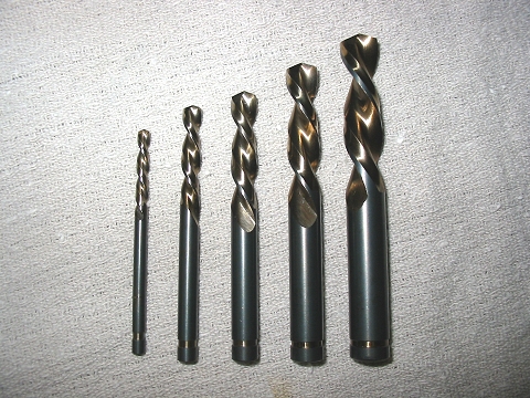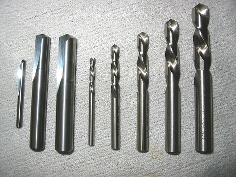 Here are some of my weapons of choice, from left, very expensive Lawson solid carbide bits, for the really hardened materials, (will cut glass) inexpensive Vermont American (set 13484 $35) stubby set for soft materials, both left hand cutting.