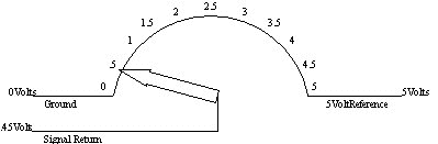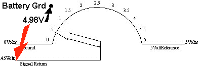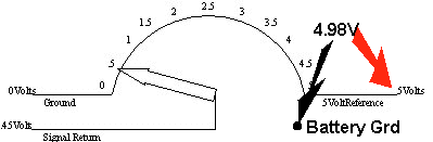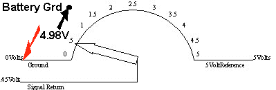 Finally, look at the ground, if all three are equal, this is a definite bad ground, 5volts in, and 5volts out on both sig return and ground, if the sensor was open internally, there would be no reading at the ground terminal at the sensor.